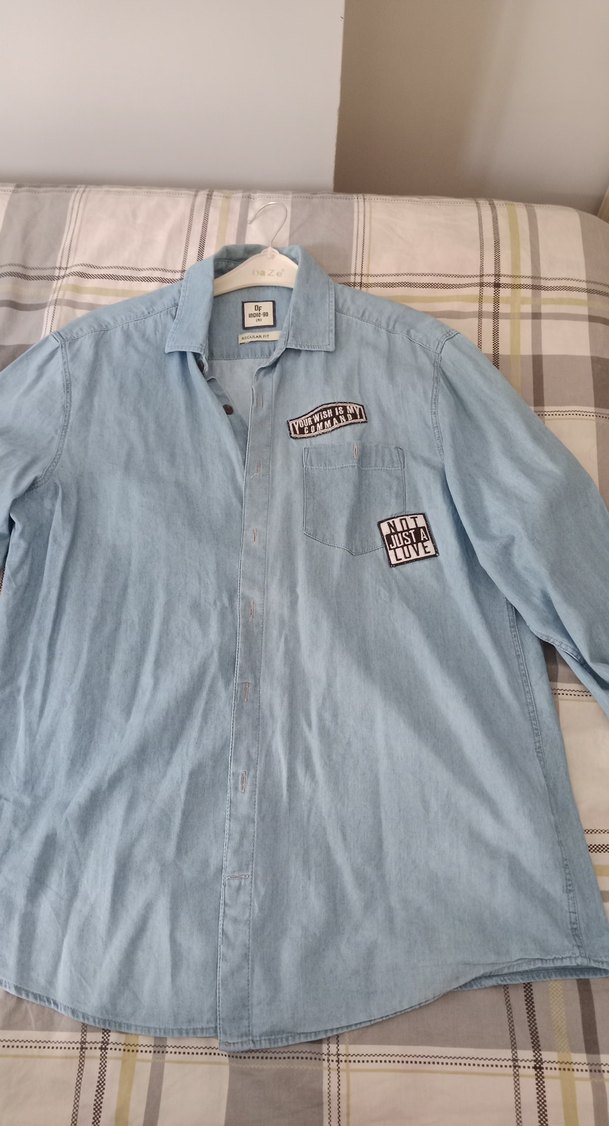 Pastel mavi renkte, düğmeli ve uzun kollu bol kesim denim gömlek. Notlu yaka ve midi uzunlukta. Önünde iki yama bulunur, günlük ve sokak stiline uygun. COVE yazısı yakada yer alır.