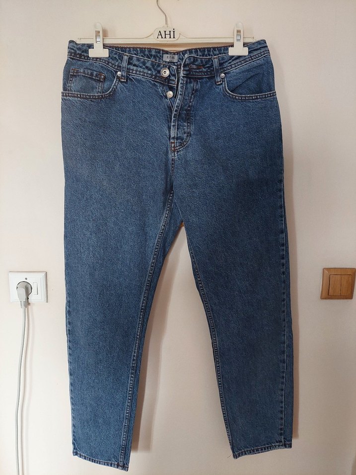 Bu mavi denim erkek jean, düğmeli ön kısmı ve regular fit kesimiyle dikkat çeker. Günlük kullanıma uygun, desen içermeyen midi boyda rahat bir sokak stilidir.