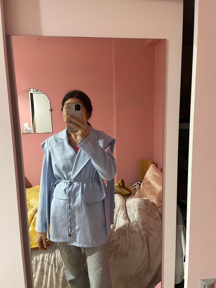 Mavi denim kumaştan, ve kuşaklı, uzun kollu kadın blazer ceket. Normal kesim, yakası kırmalı ve günlük kullanıma uygun.