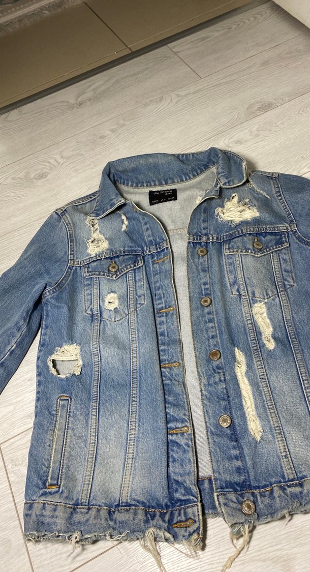 Düğmeli, uzun kollu ve yaka detaylı bu mavi denim ceket, rahat kesimi ve yıpranmış detaylarıyla günlük kullanıma uygundur.