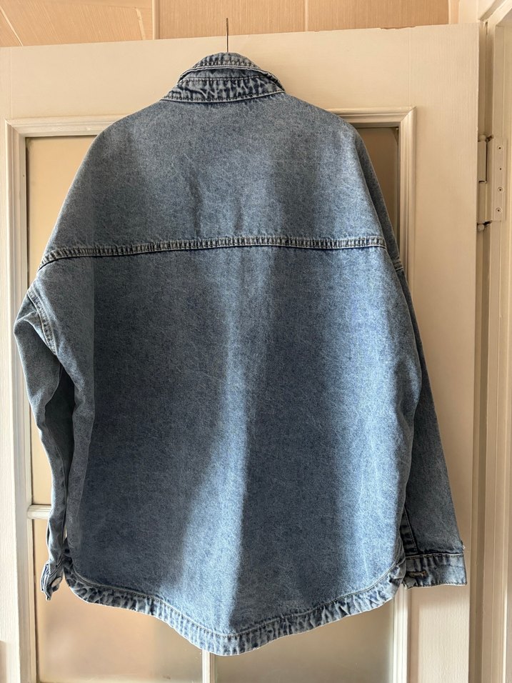 Düğmeli, uzun kollu, mavi denimden yapılmış, bol kesim ve normal boyda kadın ceket. Notlu yaka detayıyla günlük sokak stiline uygun.