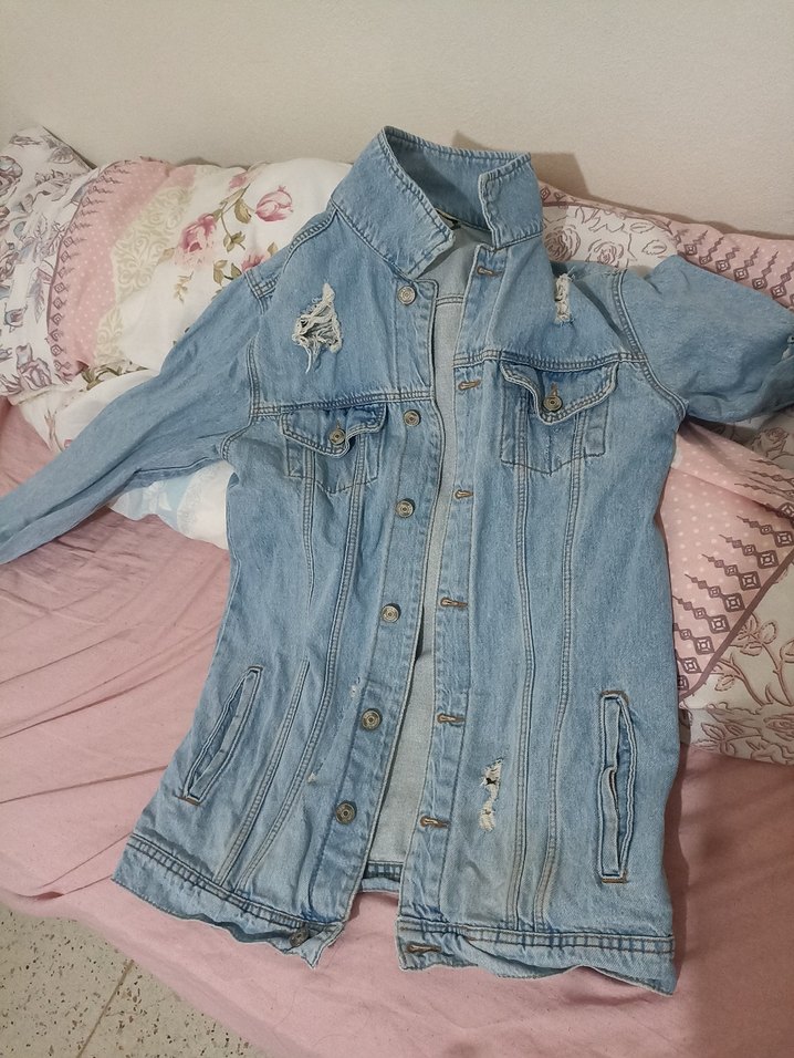 Fitted kesim, düğmeli mavi denim ceket, uzun kollu ve yakası kesik detaylı, pastel tonlarda, günlük sokak stiline uygun.