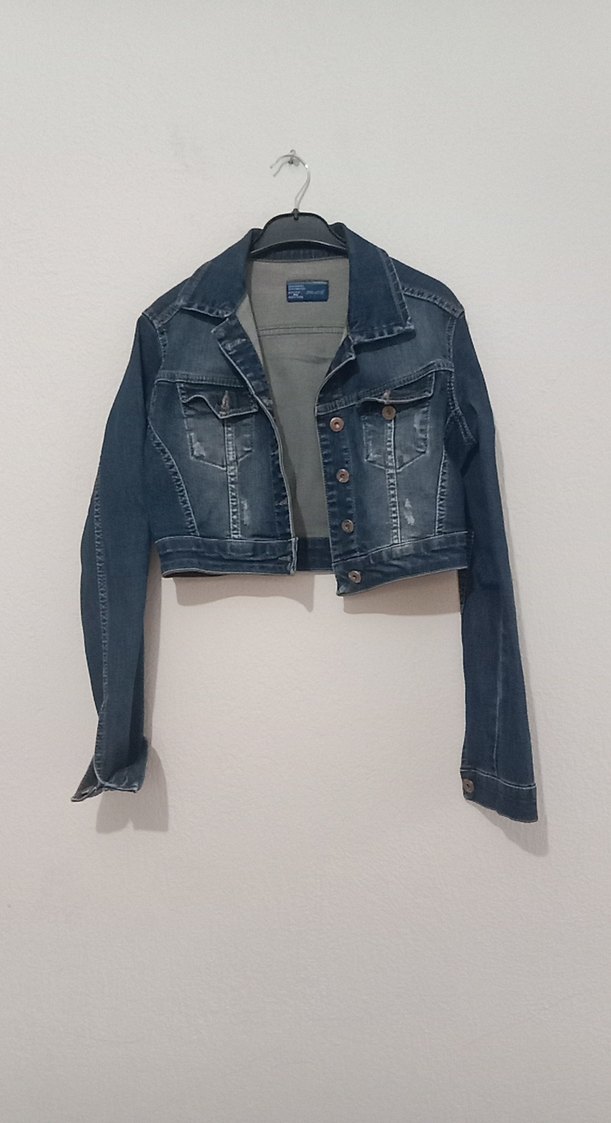 Düğmeli ön kısmı, uzun kollu, kesimli mavi denim kadın ceket. Günlük rahat sokak stili için uygun.