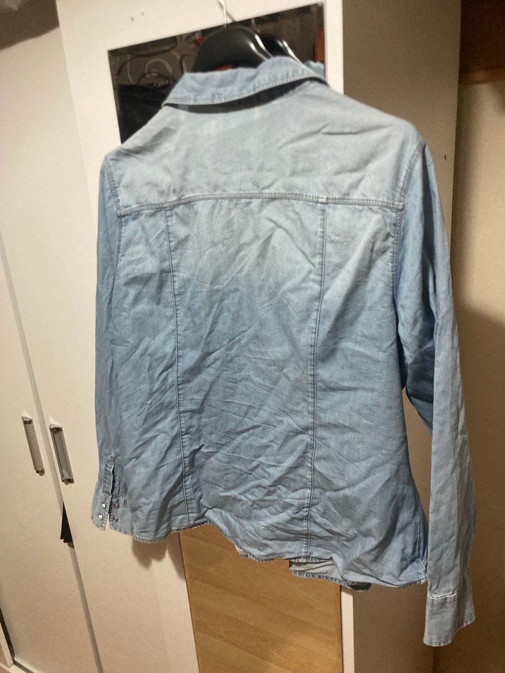 Düğmeli, uzun kollu, mavi denim kadın gömlek. Yaka ve normal boyda, günlük ve sokak stiline uygun, vücuda oturan kesim.