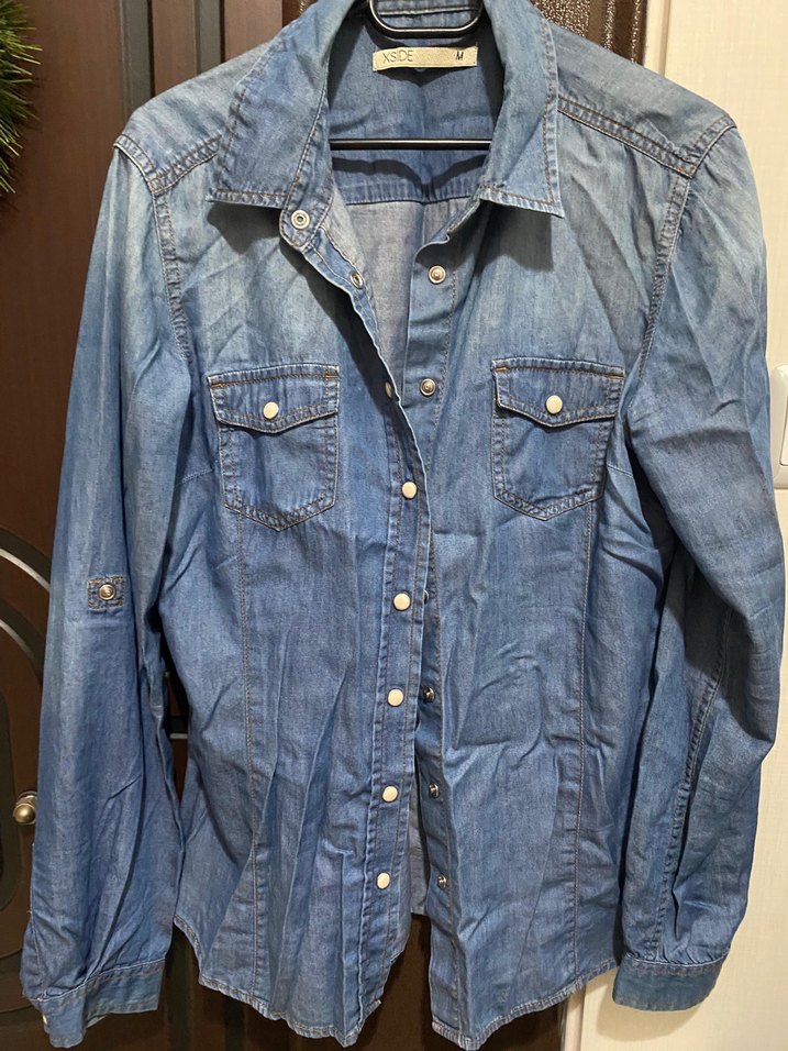 Parlak mavi denimden yapılmış, düğmeli ve cepli, uzun kollu, geniş kesim kadın gömleği. Günlük sokak stili için uygundur.
