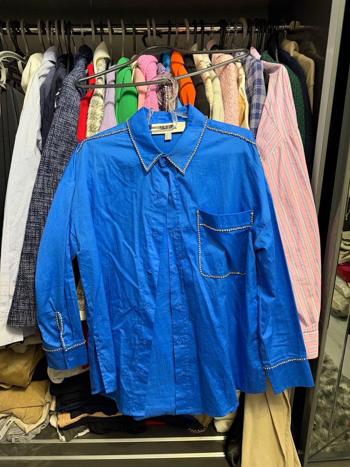Uzun kollu, düğmeli, mavi denim gömlek. Notlu yaka ve cep detayına sahip, bol kesim ve normal boyda. Günlük sokak stili için uygun, parlak tie-dye deseni bulunur. 40 bedene de olur