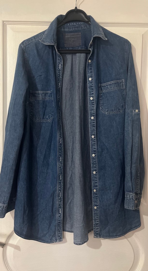 Düğmeli, yaka detaylı, bol kesim mavi denim gömlek. Uzun kollu ve iki cepli, günlük rahat kullanıma uygun.