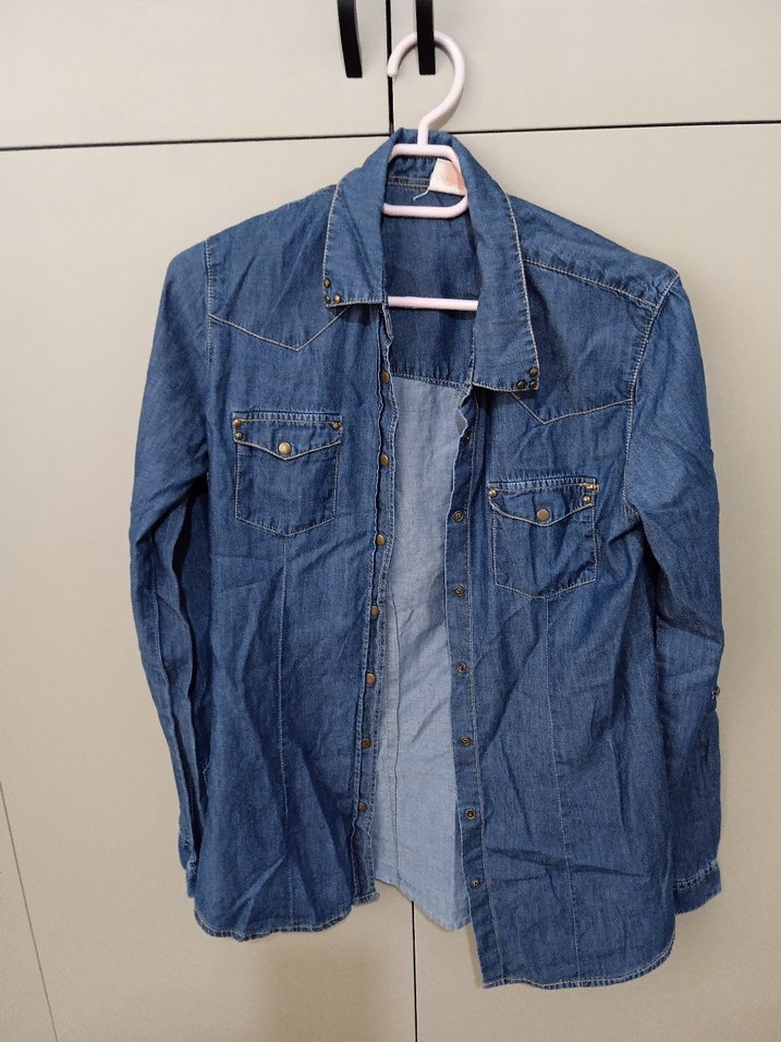 Mavi denim kadın gömlek, düğmeli, yaka kısmı kesimli ve uzun kolludur. Rahat ve bol kesimiyle günlük sokak stiline uygundur. kolda bir çıt çıt eksik