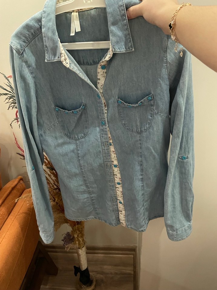 Düğmeli, uzun kollu, yakalı ve dar kesim mavi denim gömlek. Önünde iki cep bulunur, günlük kullanıma uygundur.