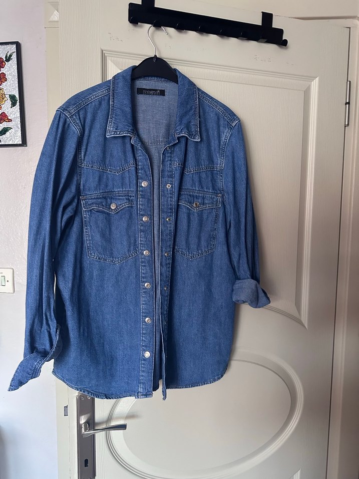 Düğmeli mavi denim kadın gömleği, uzun kollu ve kesimli yaka detaylarına sahiptir. Normal midi boyu ve bol kesimiyle günlük rahat kullanıma uygundur.