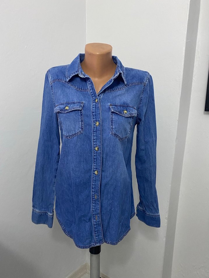 Düğmeli, uzun kollu mavi denim kadın gömlek. Notch yaka ve bol kesim, parlak renkte, günlük rahat stil için uygun.