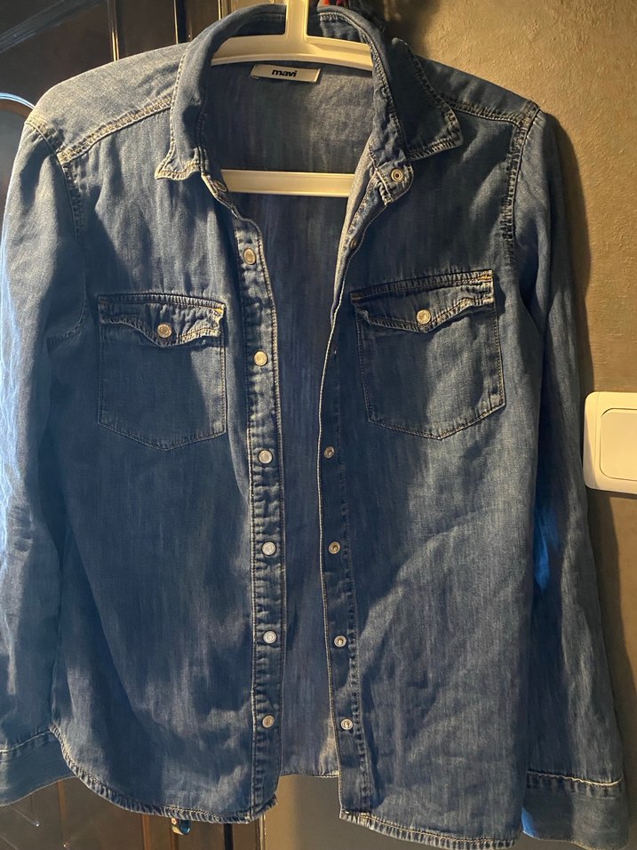Gevşek kesim, uzun kollu, düğmeli mavi denim gömlek. Notlu yaka ve göğüs cepleri bulunur, günlük sokak stili için uygun.