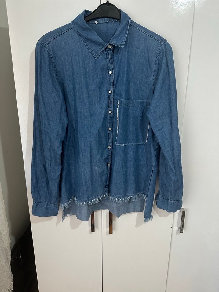 Mavi renkli denim kadın gömlek, düğmeli, uzun kollu ve bol kesimdir. Notlu yaka ve tek cep detayına sahiptir. Alt kısmı püsküllüdür ve günlük rahat stil sunar.