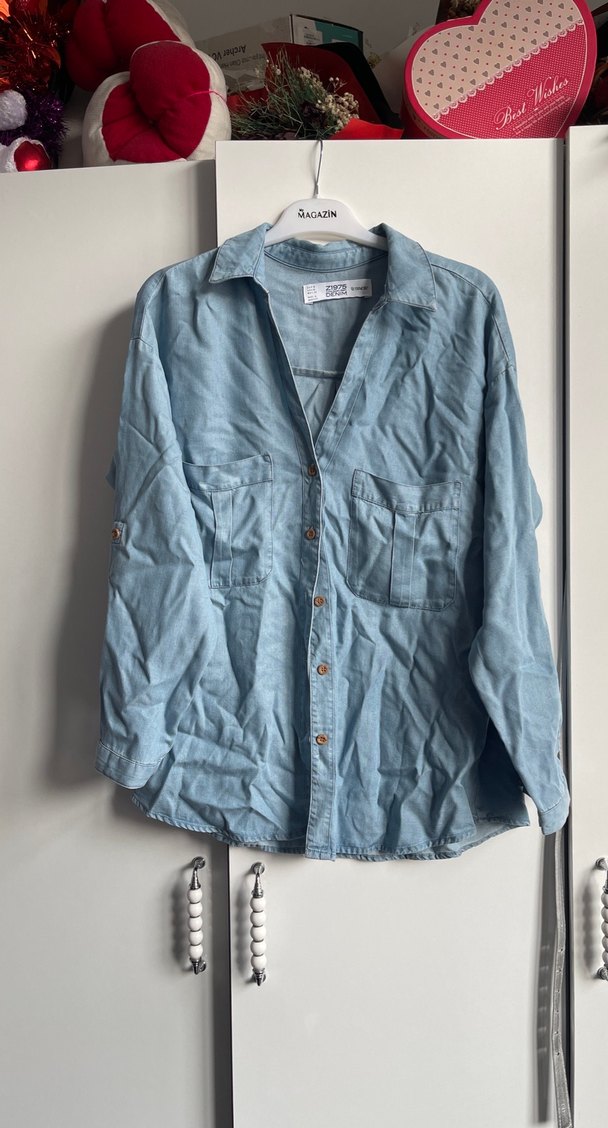 Düğmeli, uzun kollu, mavi denim gömlek. Salaş kesim, yakalı ve normal midi boyda, iki ön cepli, günlük sokak stili için uygun.