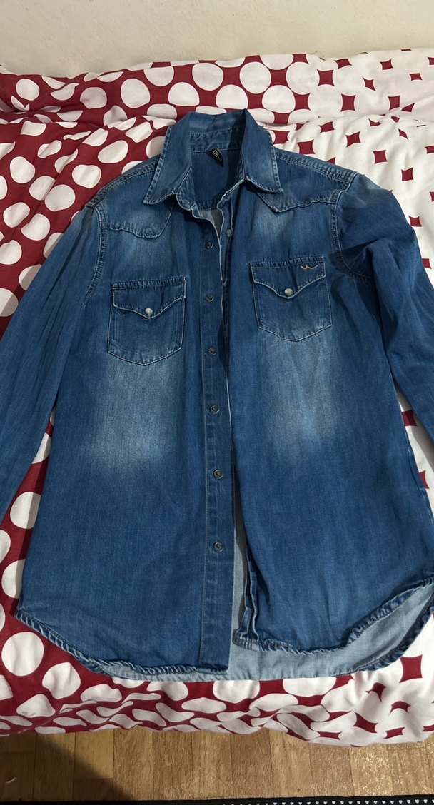 Mavi denim kadın gömleği, düğmeli önde, uzun kollu ve kesimli yaka detaylıdır. Rahat kesimi ve midi boyu ile günlük sokak stiline uygundur. İki göğüs cebi ve parlak dokusu vardır.