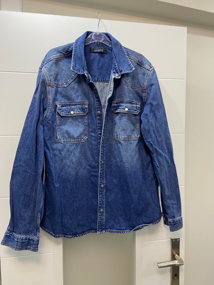 Parlak mavi denim kadın gömlek, düğmeli, çıtçıtlı ceplerle, uzun kollu ve bol kesimdir. Günlük sokak stili için rahat bir seçenektir.
