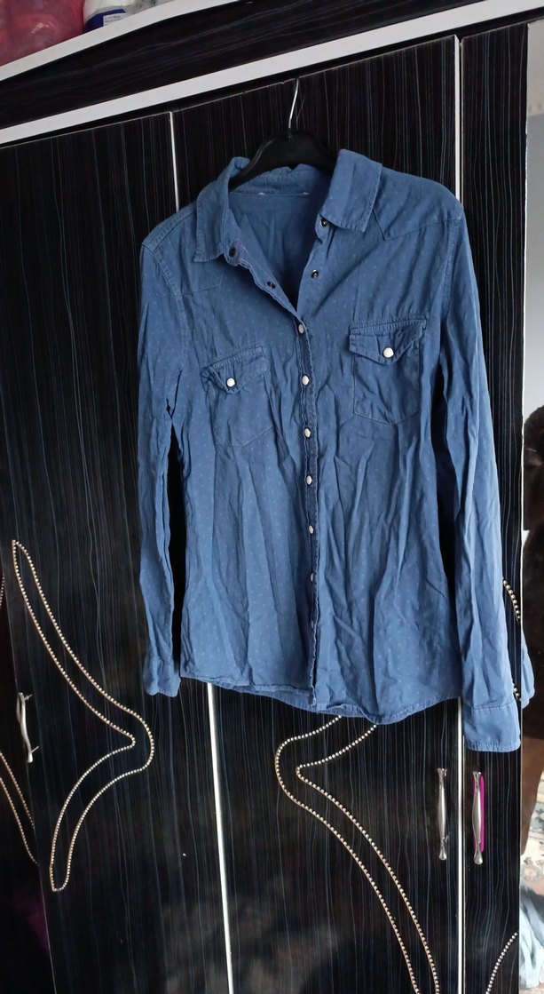 Düğmeli ön kısmı, yakalı ve uzun kollu bu mavi denim gömlek, rahat kesimi ve midi boyuyla günlük sokak stiline uygundur.