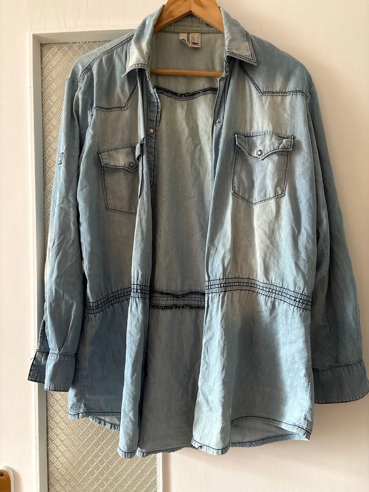 Mavi denim kumaştan, düğmeli, cepli ve uzun kollu kadın gömleği. Salaş kesimi ve yakasıyla günlük bohem tarz sunar. Ön tarafından fotoğrafta da görünen sökükler var