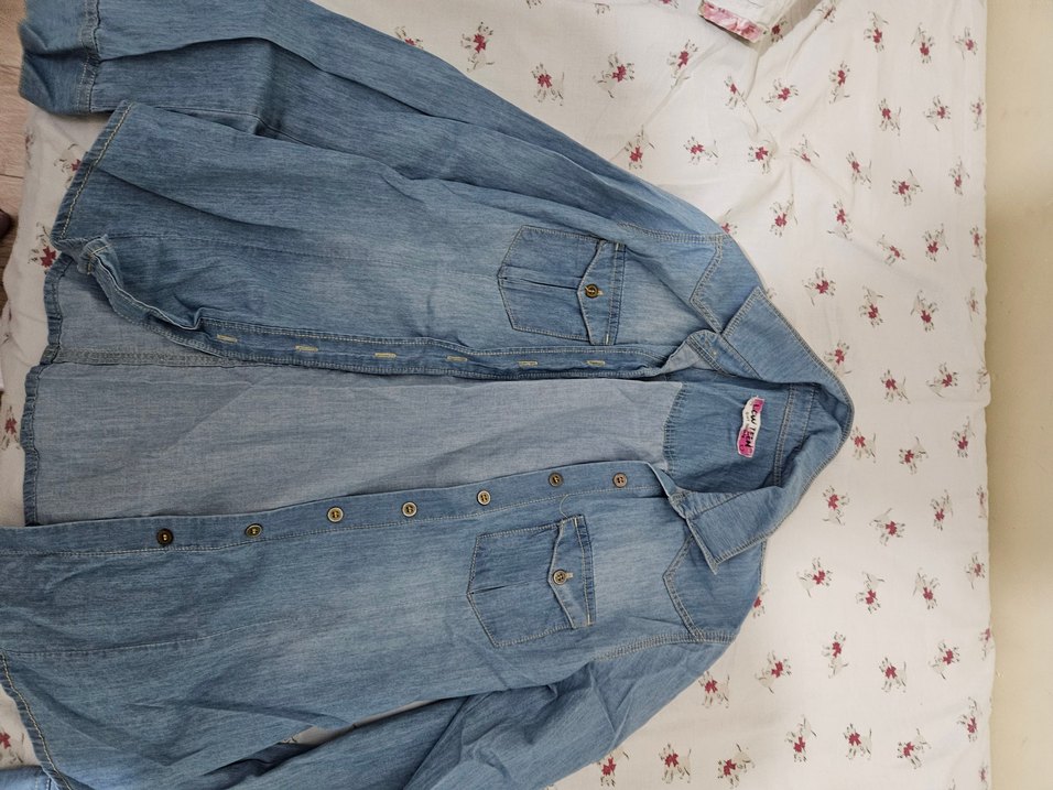Düğmeli, uzun kollu, mavi denim kadın gömlek. Notlu yaka ve cep detaylarına sahip, bol kesim, günlük rahat kullanıma uygun.