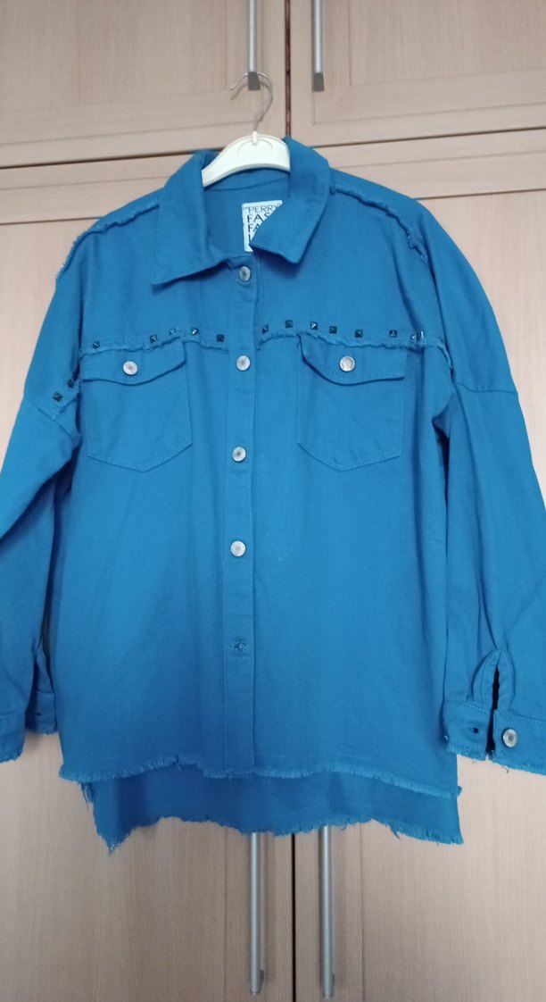 Mavi denim kalın kumaştan uzun kollu, düğmeli kadın gömleği. Salaş kesim, çentikli yaka ve iki cep bulunur. Parlak yüzeyiyle günlük sokak stiline uygundur.