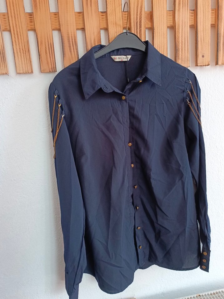 Düğmeli, yakalı ve uzun kollu mavi denim kadın gömleği. Zincir detayları ve parlak yüzeyiyle günlük sokak stiline uygun.