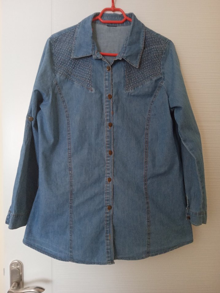 Düğmeli, mavi denim kadın gömlek. Uzun kollu, notched lapel yaka ve rahat kesim ile günlük kullanıma uygundur. marka temsilidir.