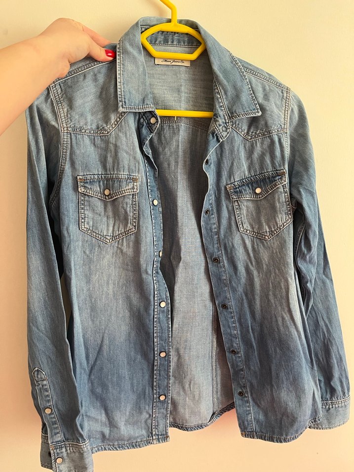 Denim gömlek, uzun kollu ve çentikli yaka detayına sahiptir. Düğmeli ön kısmı ve iki cep ile günlük sokak stili için uygundur. Mavi ve desensiz tasarımı günlük kullanıma uygundur.