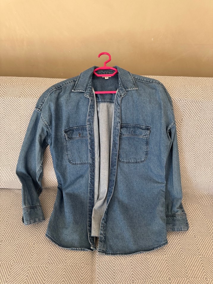 Mavi denim gömlek, düğmeli ve iki cep detaylıdır. Bol kesim, kesik yakalı ve uzun kolludur. Günlük kullanıma uygun rahat sokak stili gömlek.