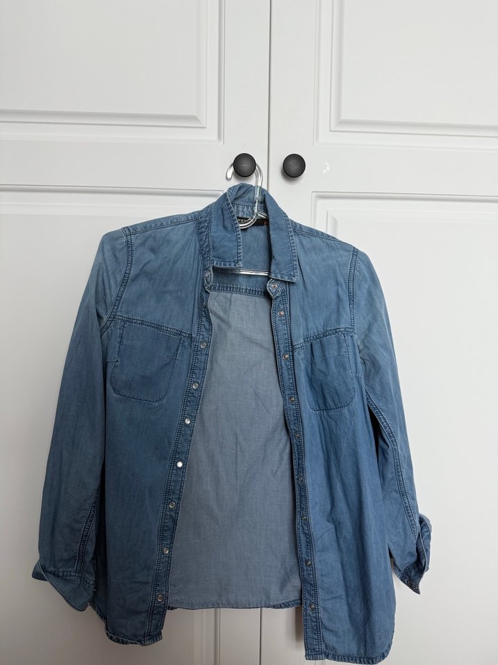 Çıtçıtlı, normal boyda, bol kesim mavi-gri tonlarında denim kadın gömlek. Notlu yaka ve uzun kolludur, gündelik kullanıma uygundur. Herhangi bir sorunu yok fakat yıkanmaya bağlı olarak renkte solma var