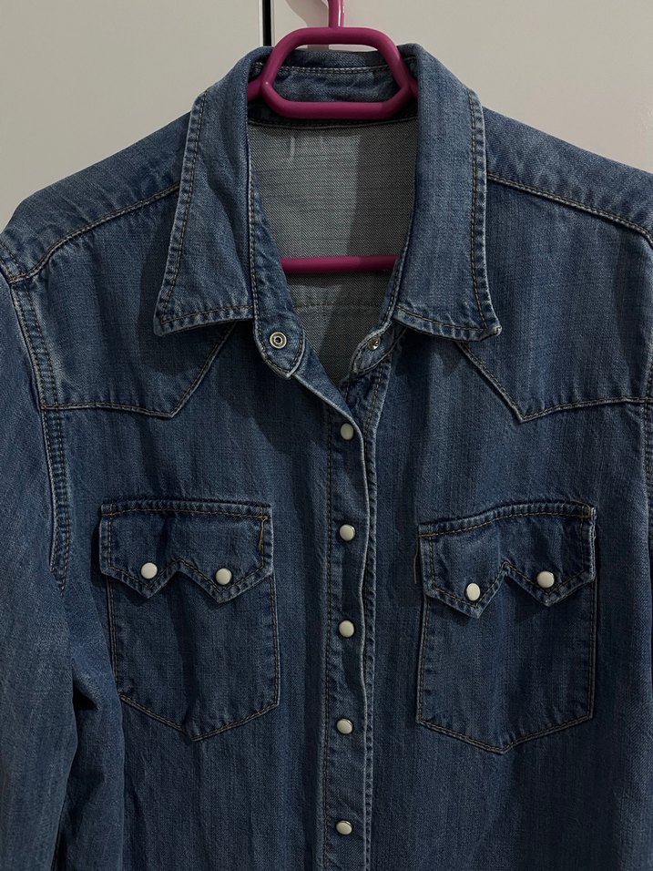 Mavi denim kadın gömlek, notalı yaka, düğmeli ön ve uzun kolludur. Düzenli kesim ve iki göğüs cebi bulunur, günlük rahat giyim için uygundur. Bir kere giyilmiştir.