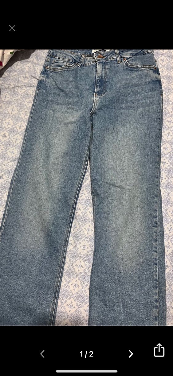 Düğmeli ön kısmı ve baskılı deseni olan mavi denim kadın jean. Slim kesim ve midi boyda, günlük rahat kullanıma uygun. W29 L32 beden.