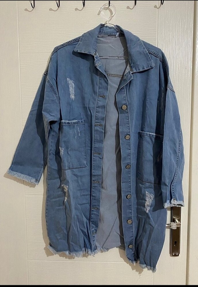 Düğmeli, uzun kollu, mavi denim kadın ceket. Midi boy, bol kesim detaylarla rahat sokak tarzı sunar.