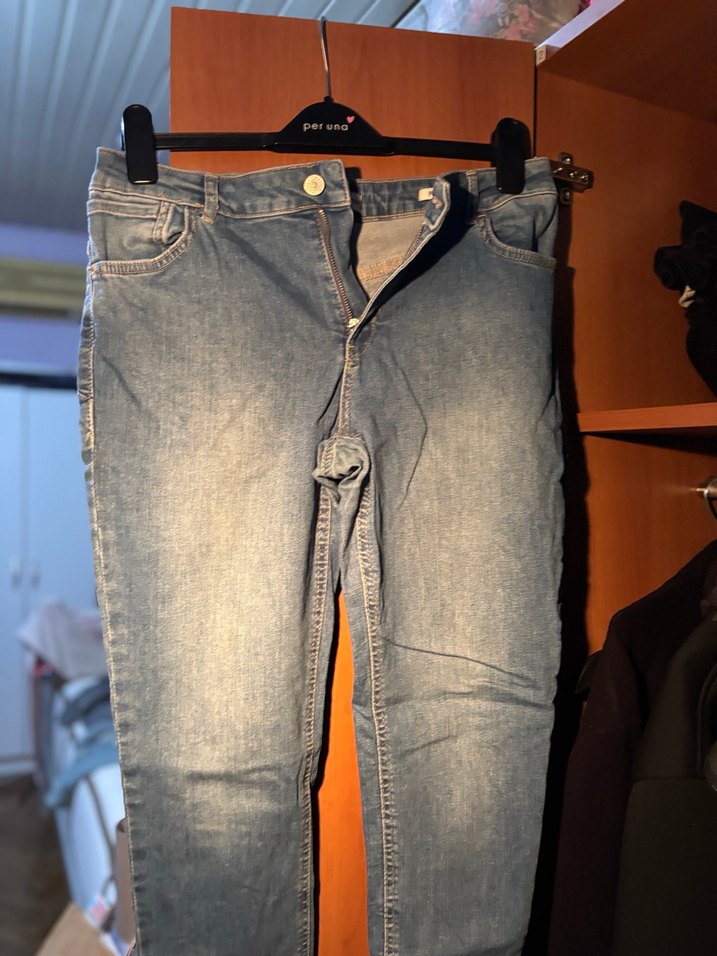 Düğmeli, normal boy, mavi denimden yapılmış, dar kesim kadın pantolon. Günlük kullanıma uygun, trend sokak stili için idealdir.