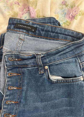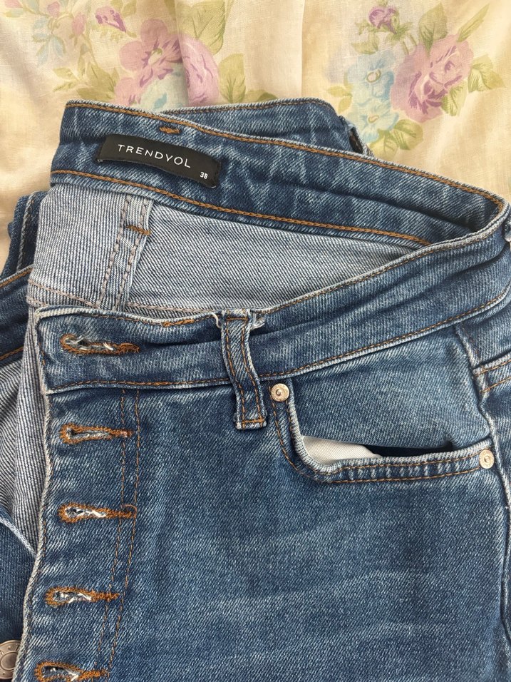 Düğmeli önüyle mavi-gri renkte, normal boy ve regular fit kesime sahip kadın denim pantolon.