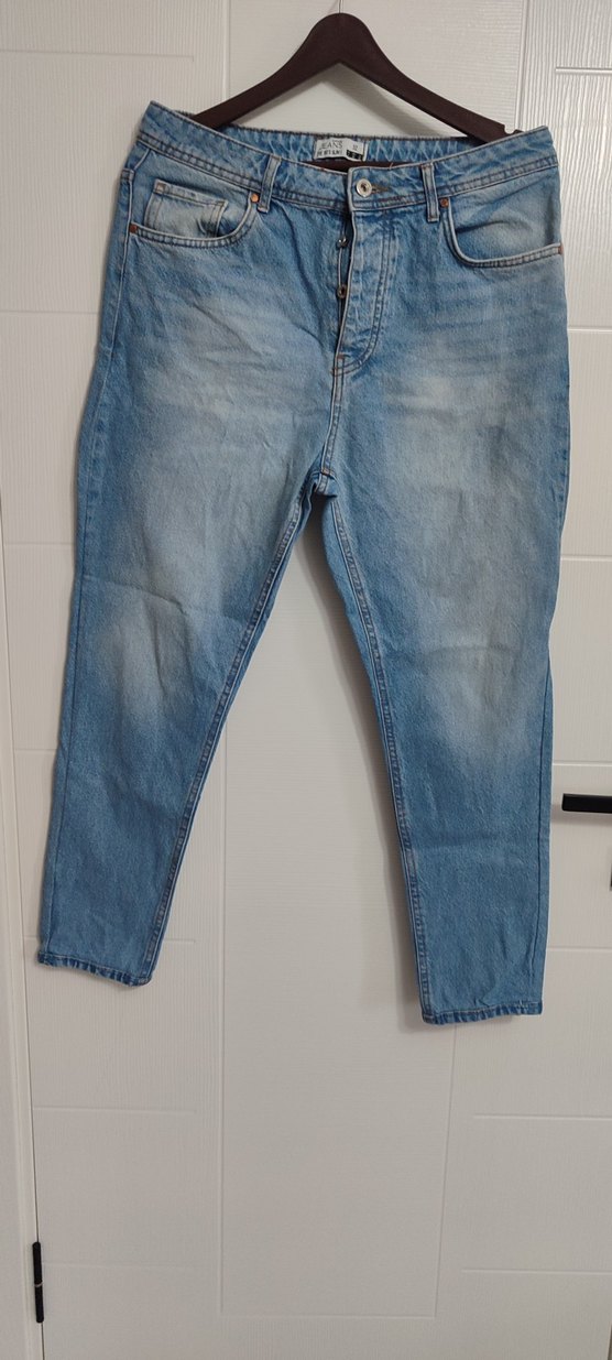 Düğmeli ön cep detaylı, pastel mavi renkli, bol kesim kadın denim pantolon. Günlük kullanıma uygun, normal boyda ve desensiz.