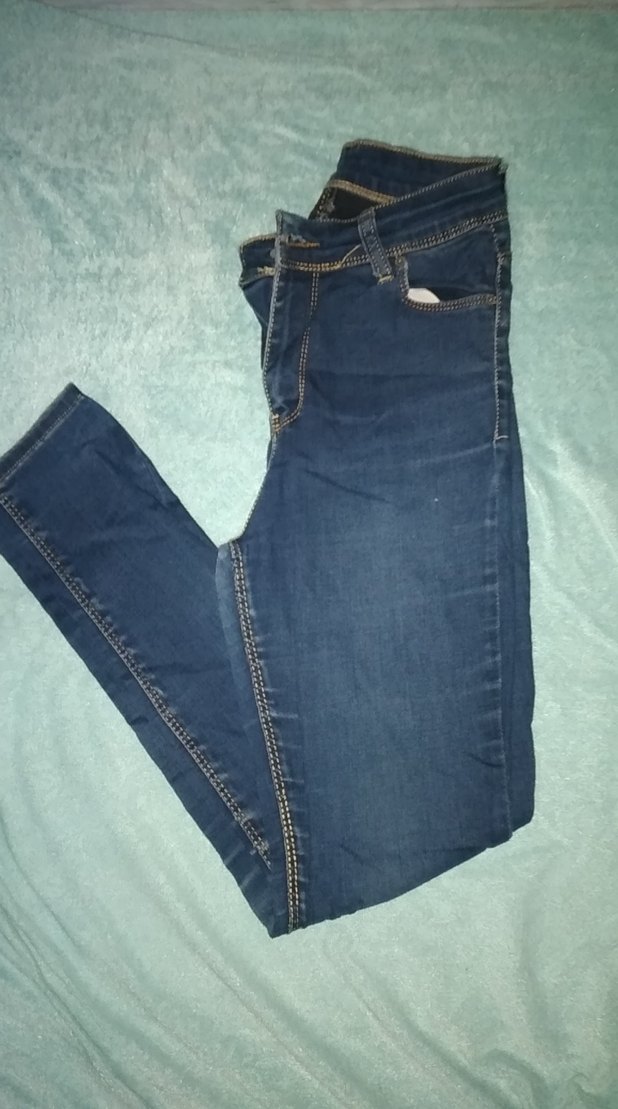 Düğmeli, parlak mavi renkte, normal boyda ve dar kesim kadın denim pantolon. Günlük sokak stili için uygundur.