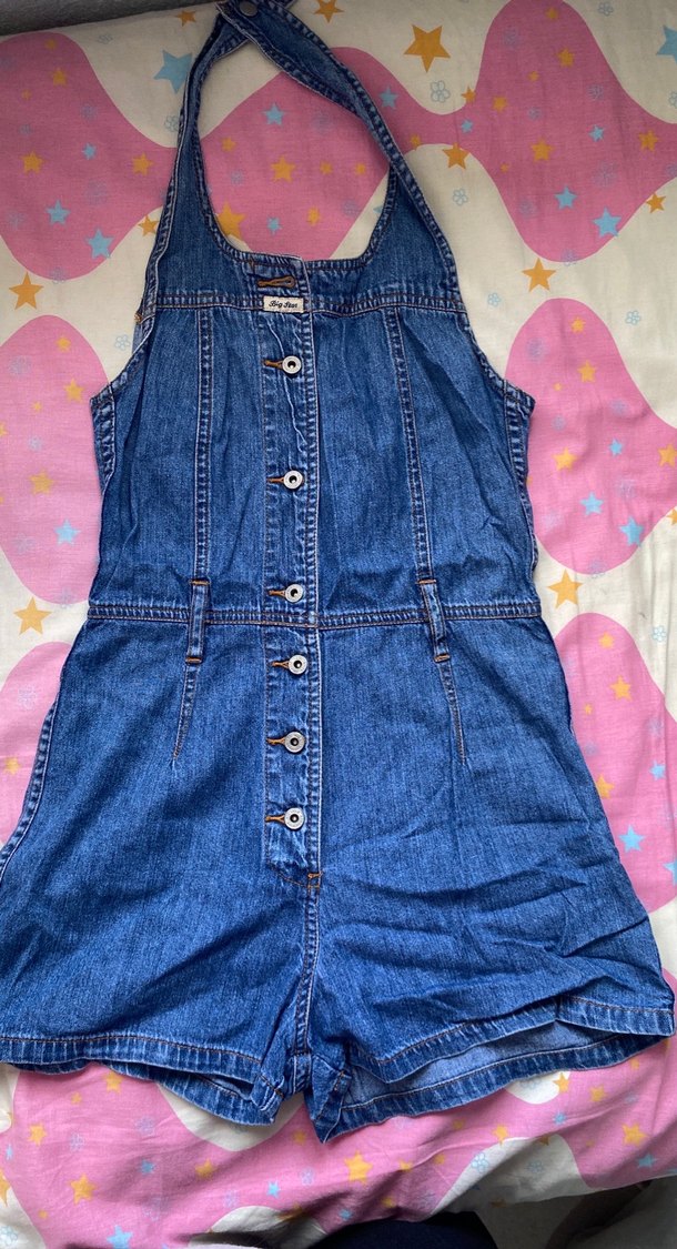 Düğmeli önü ve askısız yaka detaylı, bol kesim mavi denim kadın tulumu vintage bohem tarzı için uygundur.