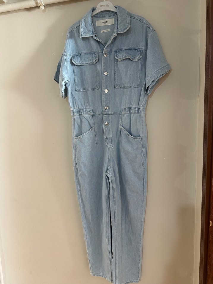 Kısa kollu, düğmeli ve yakalı mavi denim kadın tulum. Normal boy ve rahat kesim, gündelik sokak stili için uygun. Ön kapaklı ve yan cepler bulunur. Hiç giyilmedi