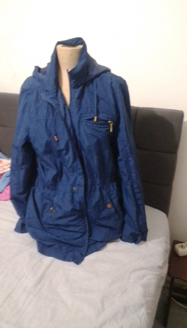 Parlak mavi denim kumaştan, düğmeli ve cepli, notched lapel yakalı, bol kesim, günlük kullanıma uygun kadın yagmurluk