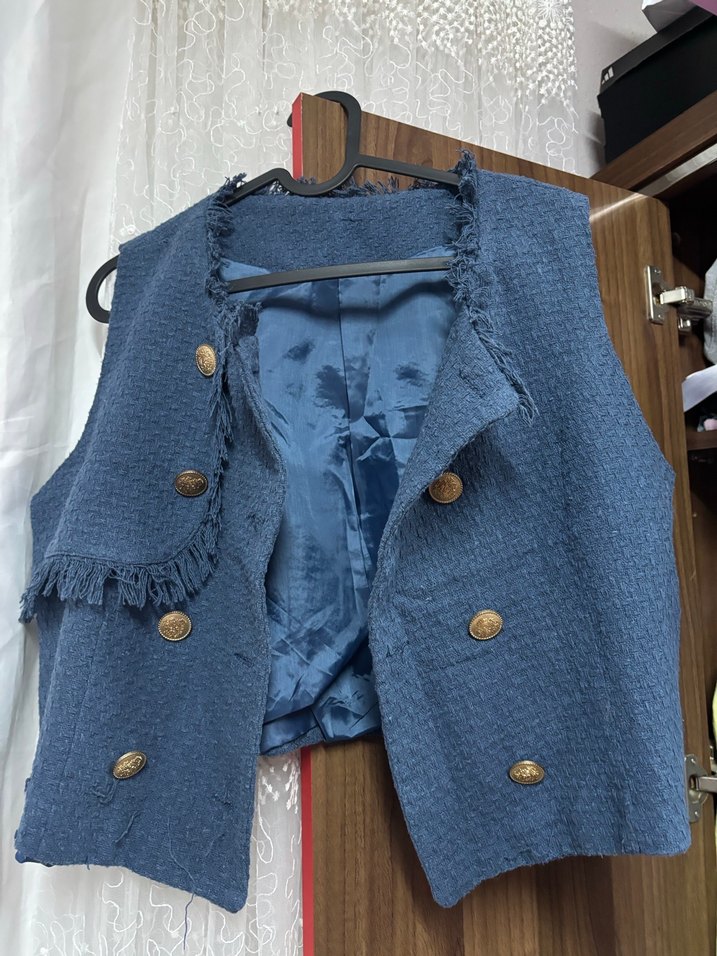 Düğmeli, mavi denim kumaştan, yakası kesik ve kolsuz olan bu yelek, bohem tarzda ve midi boyda, şık ve rahat bir görünüm sunar.