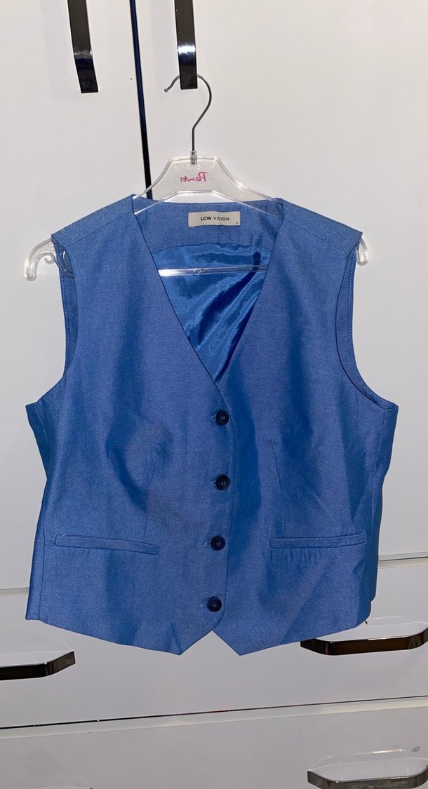 Düğmeli, yakalı mavi denim kadın yelek. Kolsuz, normal midi boyda ve regular fit. Ofis ve sokak stiline uygun. Hiç giyilmedi