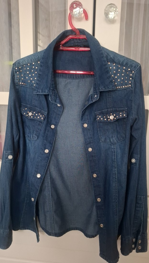 Uzun kollu, düğmeli, çentikli yakalı mavi denim gömlek. Omuz ve ceplerde parlak çıtçıt detayları bulunur. Günlük ve sokak stiline uygundur.