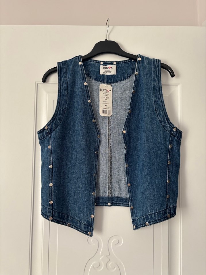 Düğmeli, kolsuz ve fitted kesime sahip bu denim ceket, parlak mavi renkte olup notched lapel yaka ve midi boydadır. Günlük sokak stiline uygundur. Hiç giyilmedi etiketli s beden
