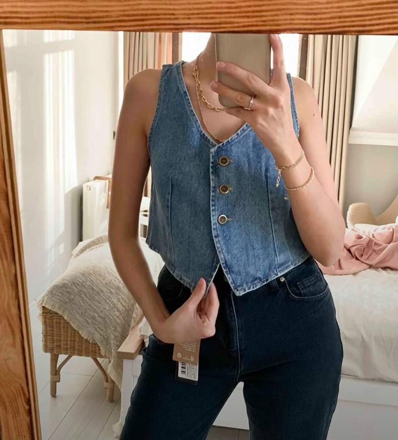 Düğmeli, kolsuz ve V yakalı bu fitted denim ceket, günlük kullanım için pastel mavi renkte rahat bir sokak stili sunar.