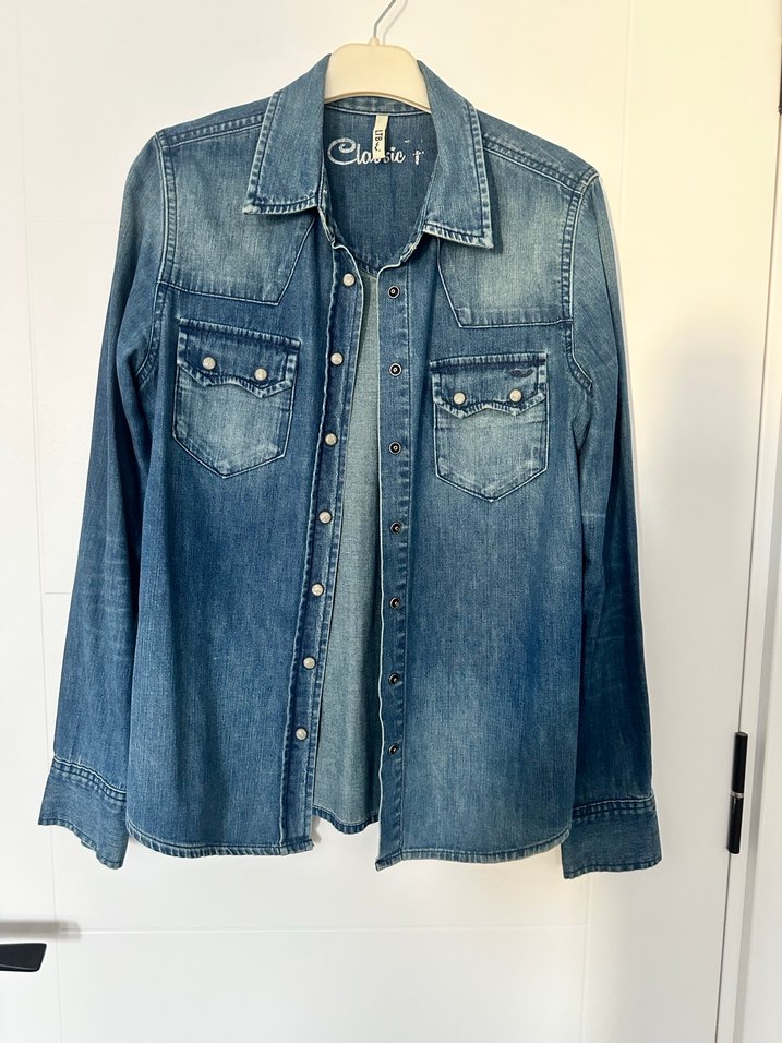 Mavi denim kadın gömlek, düğmeli ön, uzun kollu normal boydadır. Kot/denim gömlek severler için uygun bir üründür.