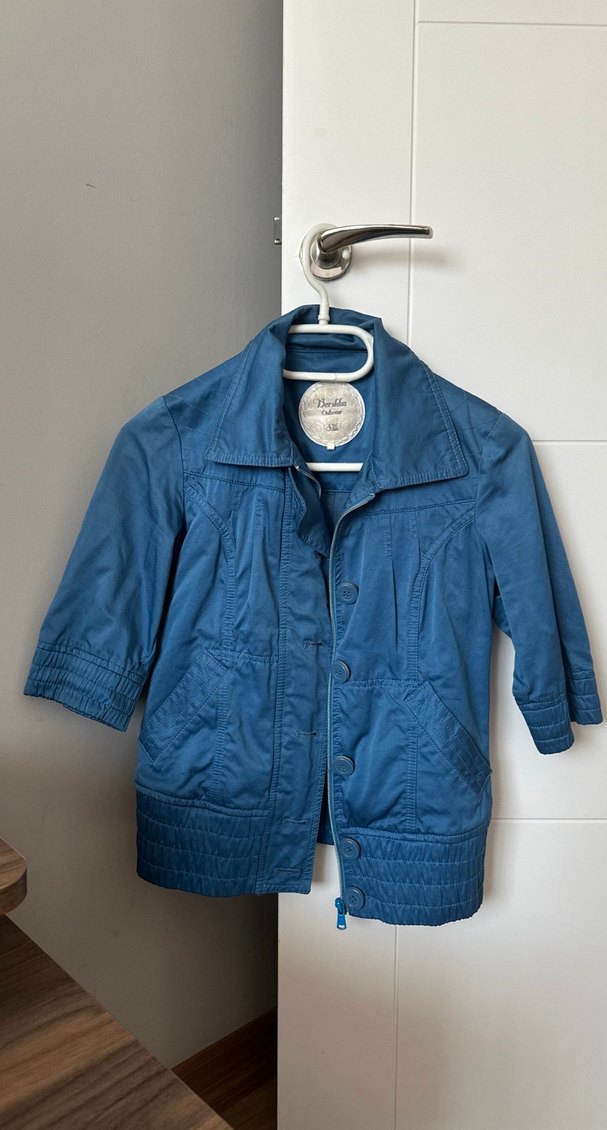 Düğmeli, kısa kollu, mavi denim midi ceket. Notlu yakalı, bol kesim ve parlak görünümlü, günlük rahat stil için uygun.
