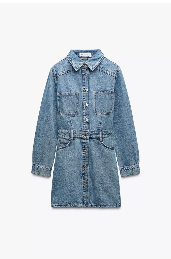 Açık mavi denim elbise, düğmeli ön, uzun kollu ve yakalı tasarıma sahiptir. Regular fit ve midi boyda, günlük sokak stili için uygundur.