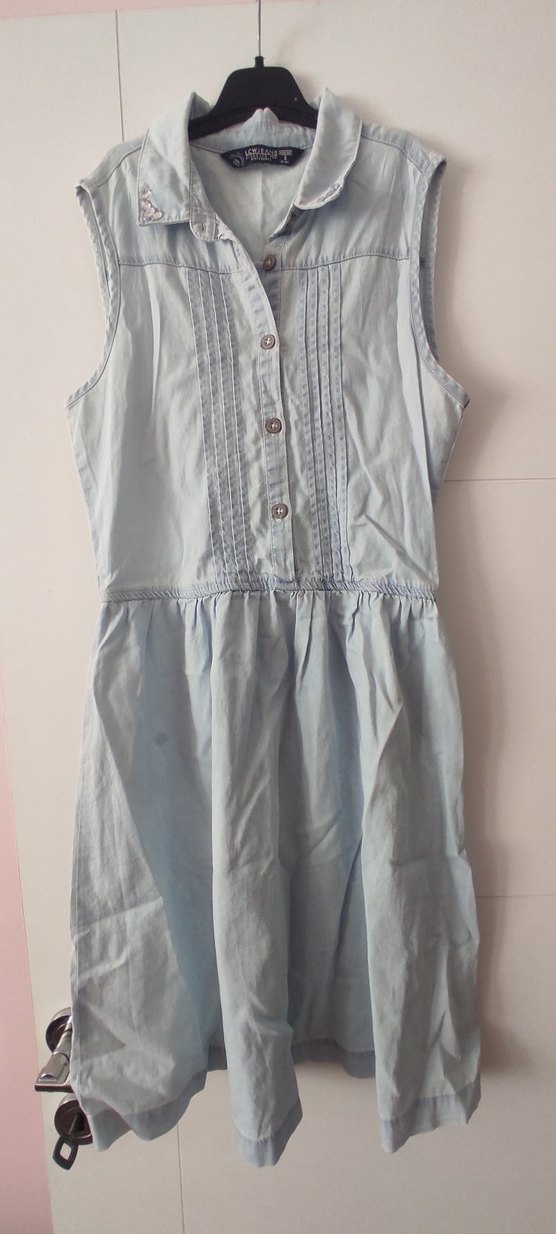 Yumuşak denim kumaştan, düğmeli ve yakalı, mavi pastel renkli, kolsuz, bol kesim midi elbisedir. Günlük kullanıma uygundur.