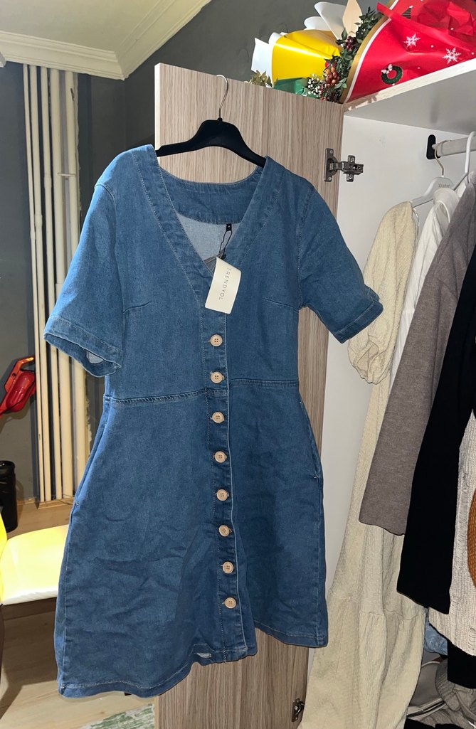 Mavi denim midi elbise, V yaka ve kısa kolludur. Düğmeli ön kısmı ve bol kesimiyle günlük bohem tarzını yansıtır.