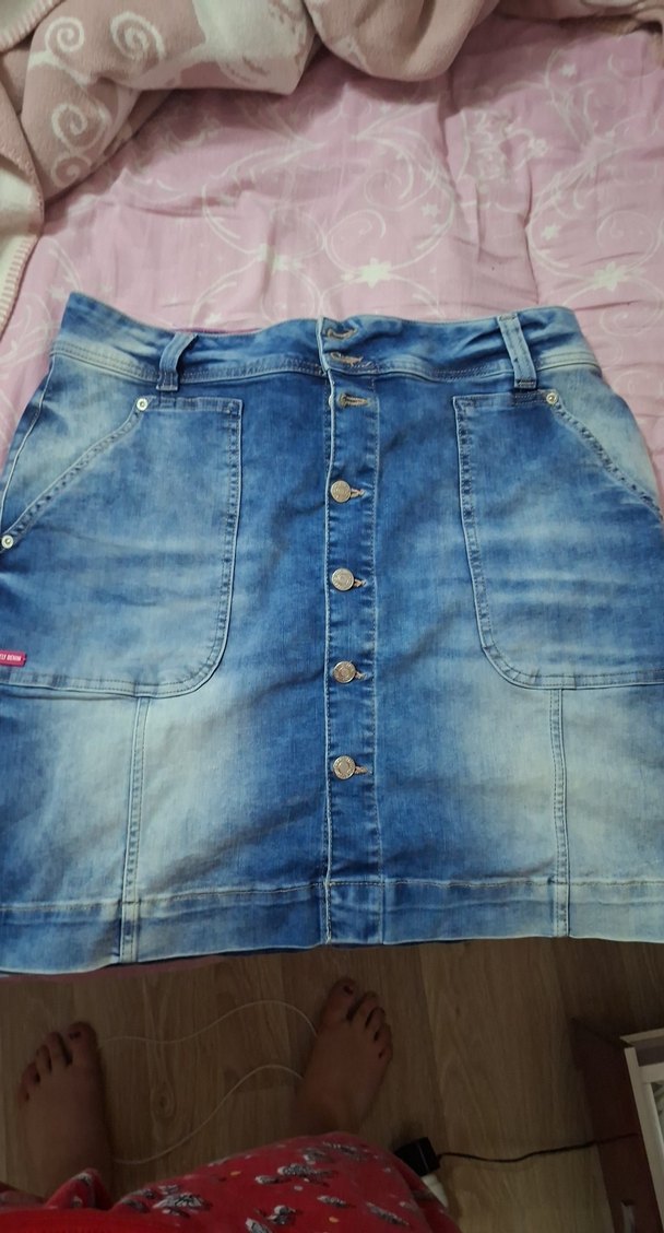 Düğmeli ve büyük cepli, bol kesim mavi denim midi etek, günlük rahat kullanım için uygundur.
